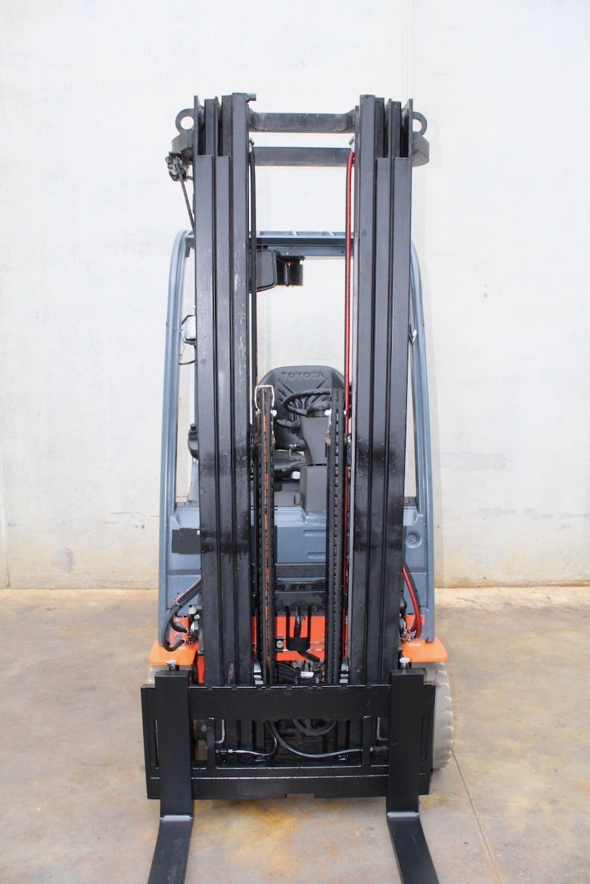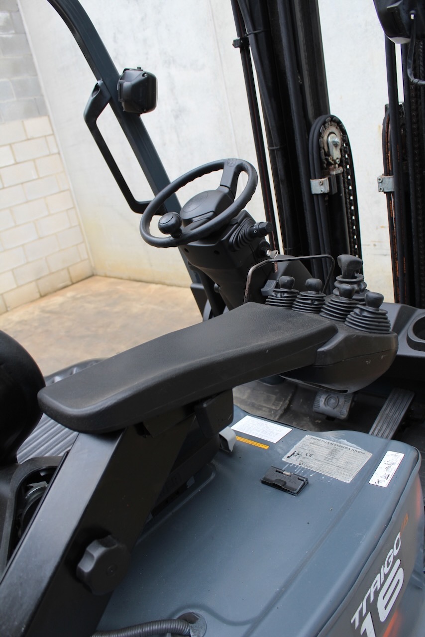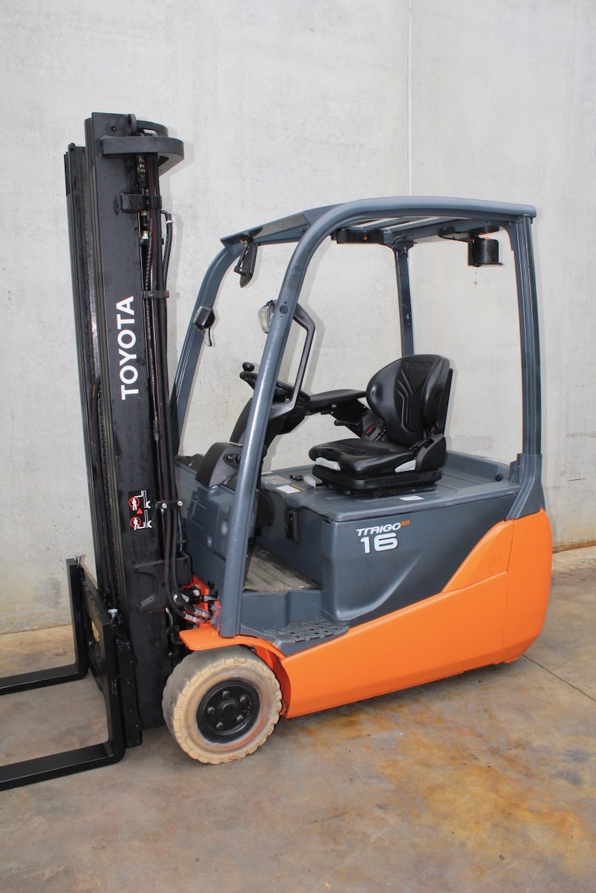 Toyota 8FBET16 Load capacity: 1.600 Kg Lifting height: 5.000 mm Mast: Triplex Fork: 1.100 mm Build height: 2.250 mm Motorization: Electric Battery: 48v/750Ah Charger: 48 v Good condition, Battery condition 83%, Integrated side-shift, 4 valve. Reference number: 7643