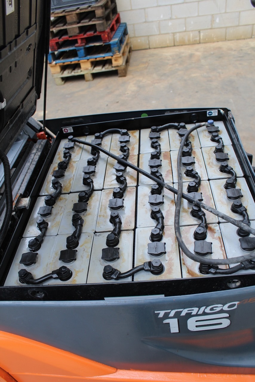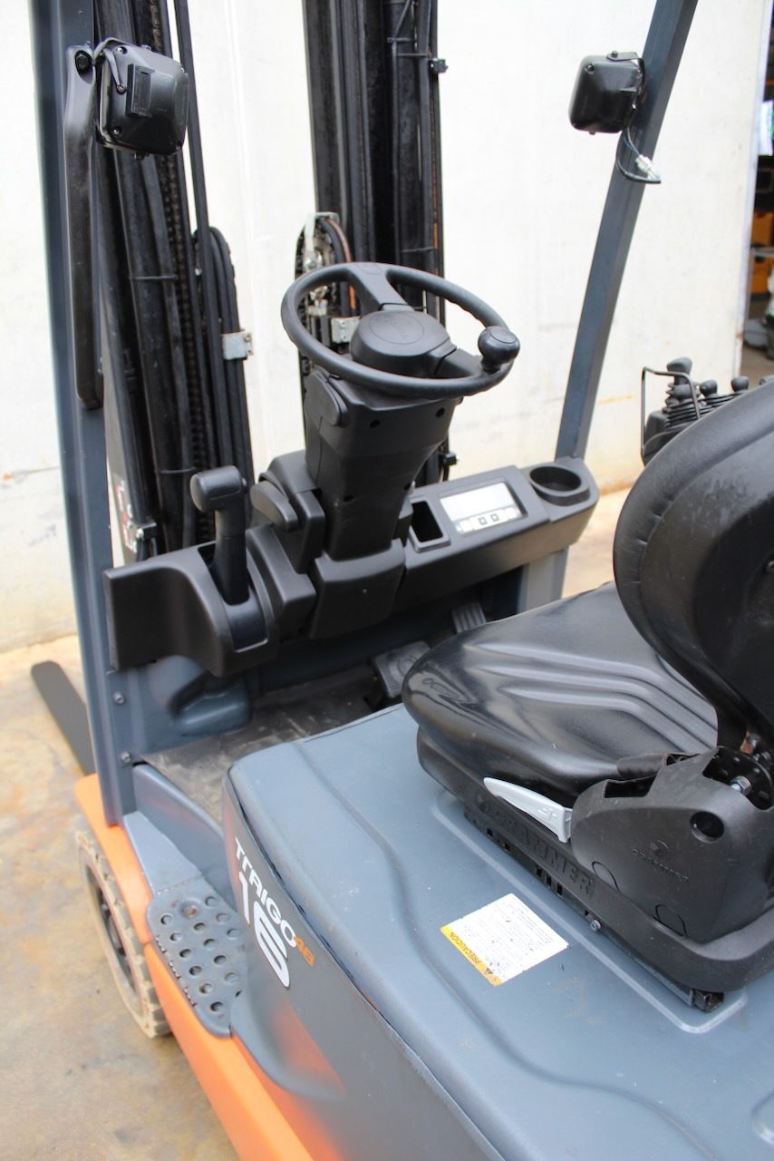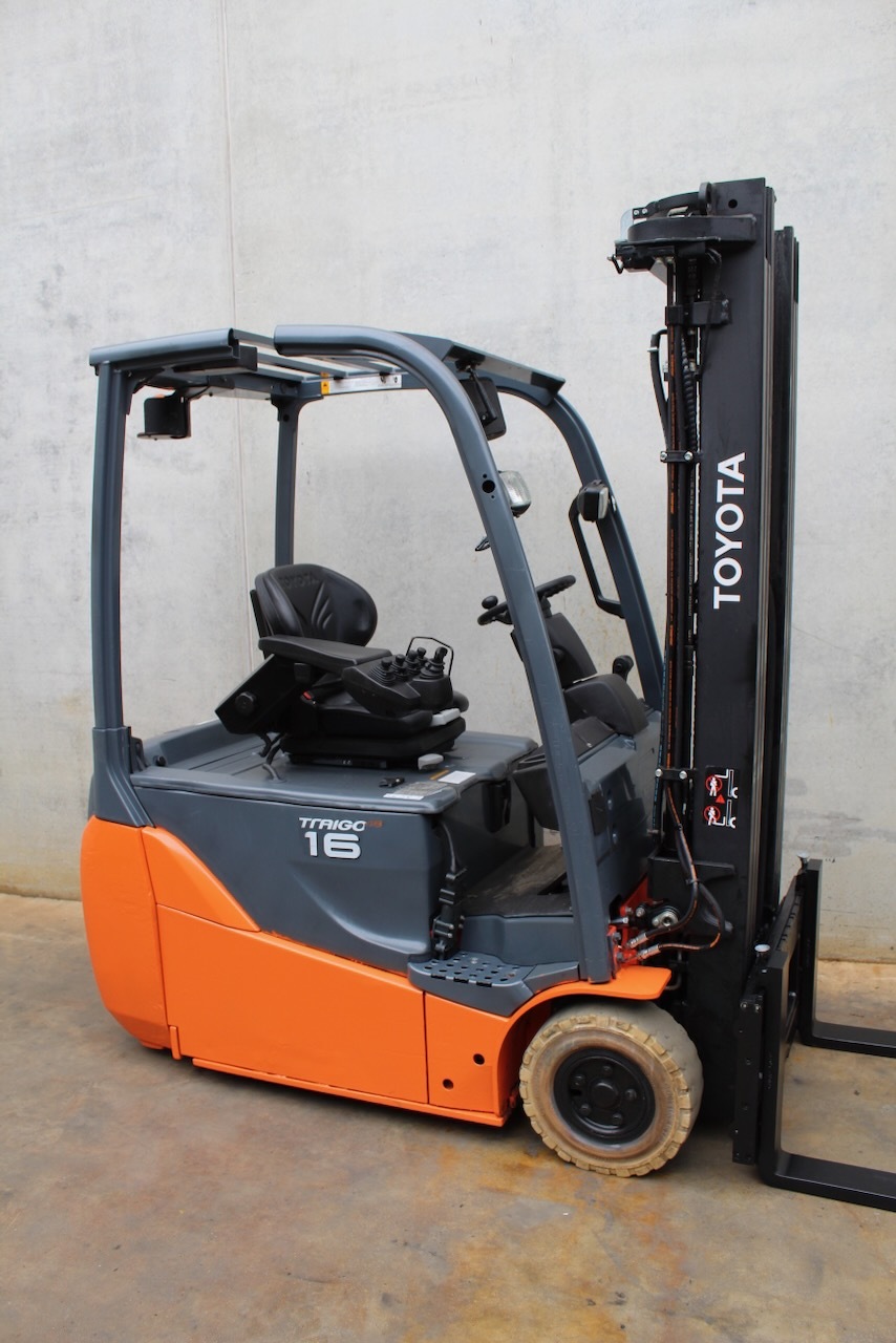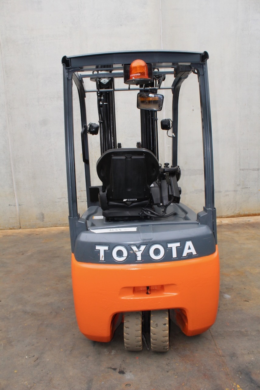 Toyota 8FBET16 Load capacity: 1.600 Kg Lifting height: 5.000 mm Mast: Triplex Fork: 1.100 mm Build height: 2.250 mm Motorization: Electric Battery: 48v/750Ah Charger: 48 v Good condition, Battery condition 83%, Integrated side-shift, 4 valve. Reference number: 7643