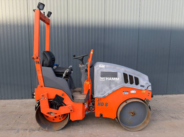 Hamm HD 8 VV tandem roller with Kubota D1005‑EF05 (14.8 kW) engine and 0.80 m drum width. Equipped with Erops cabin, water sprinkler system, drum drive, dual vibrating drums, and backup alarm. EPA and CE certified.In very good and very clean condition, ready for work.
