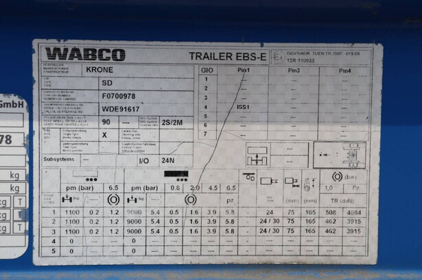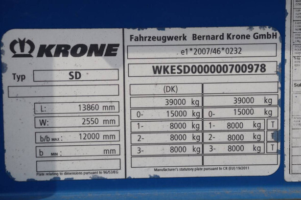 Brand: Krone Type: SD Chassis number: WKESD000000700978 Year of construction: 2016 MTM: 39000 kg Number of axles: 3 Brakes: Drum brakes Dimensions: 13860 x 2550 mm