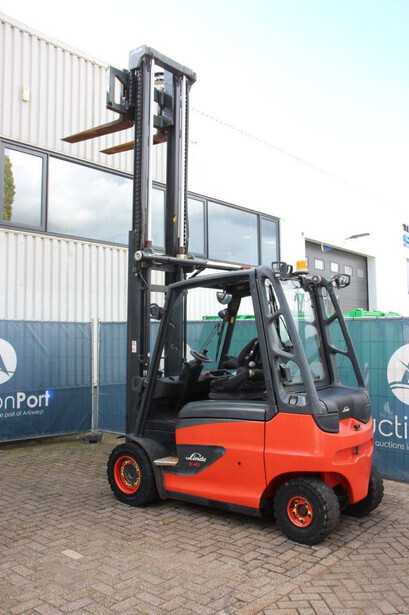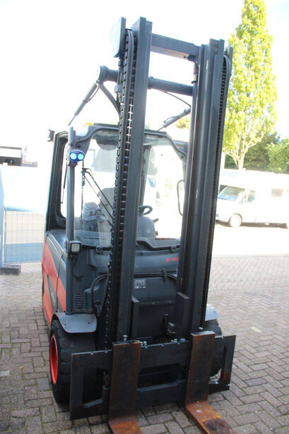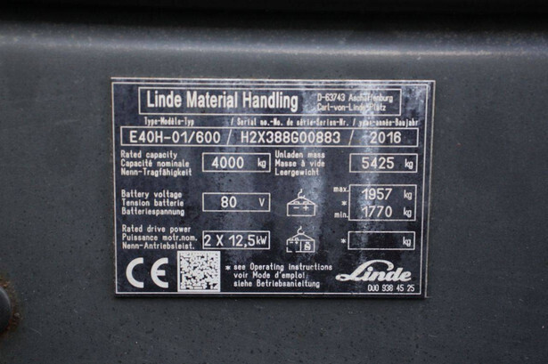 Brand: Linde Type: E40H-01/600 Serial number: H2X388G00883 Year of construction: 2016 Fuel: Electric Mast type: Duplex Sideshift: Yes Lifting capacity: 4000 kg Lifting height: 4200 mm Reading operating hours: 10118 h Machine weight: 7382 kg Tires: Solid tires Color: red