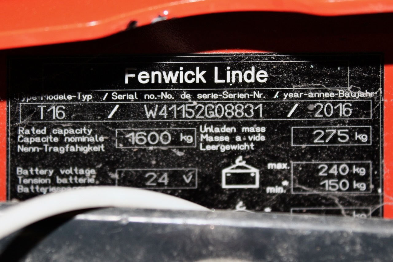 Linde T 16 Load capacity: 1.600 Kg Lifting height: Mast: Fork: 1.150 x 520 mm Build height: Motorization: Electric Battery: No Charger: 24 v incorporated Good condition, Without battery.