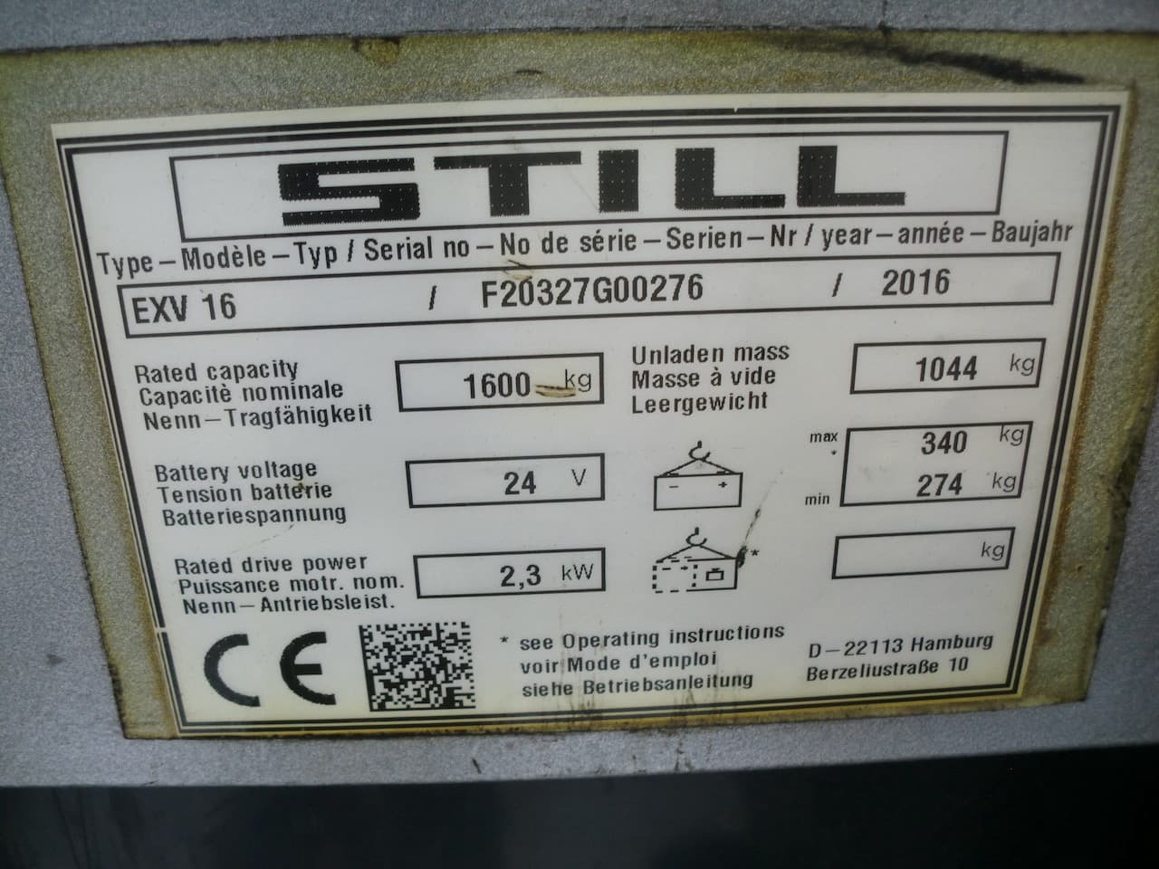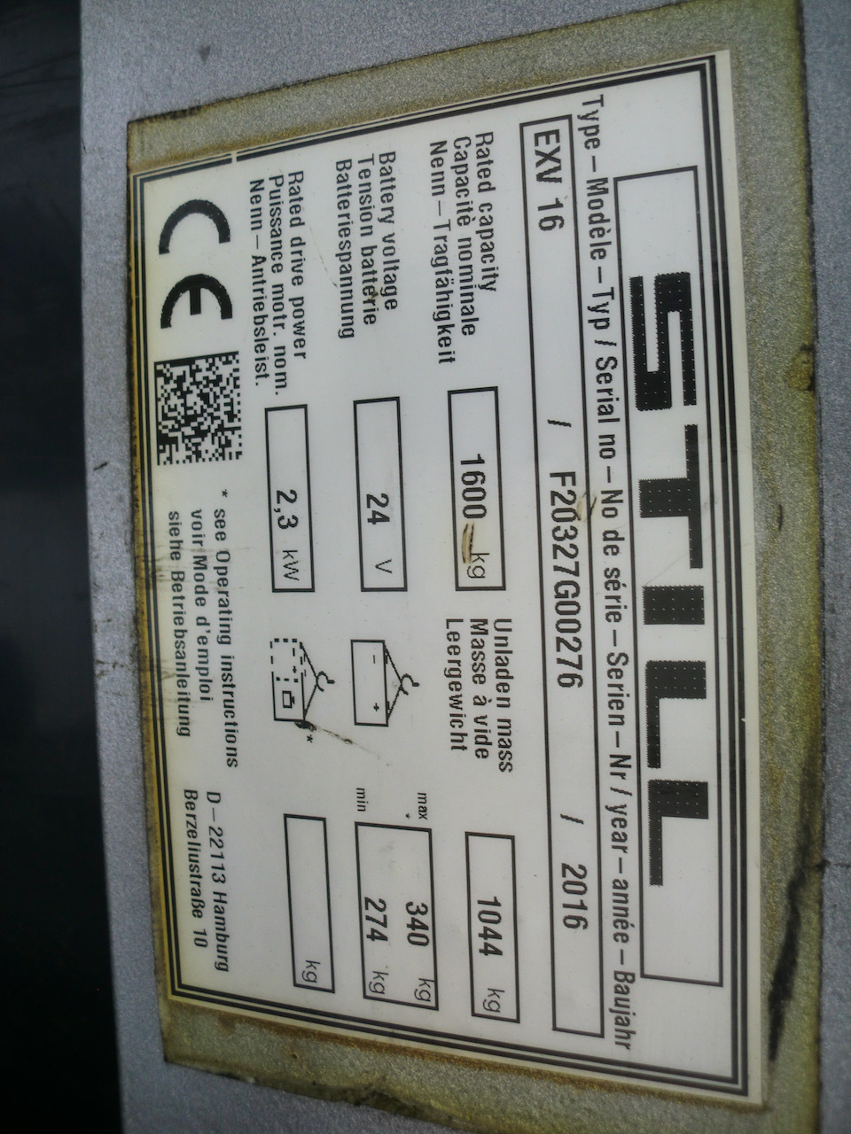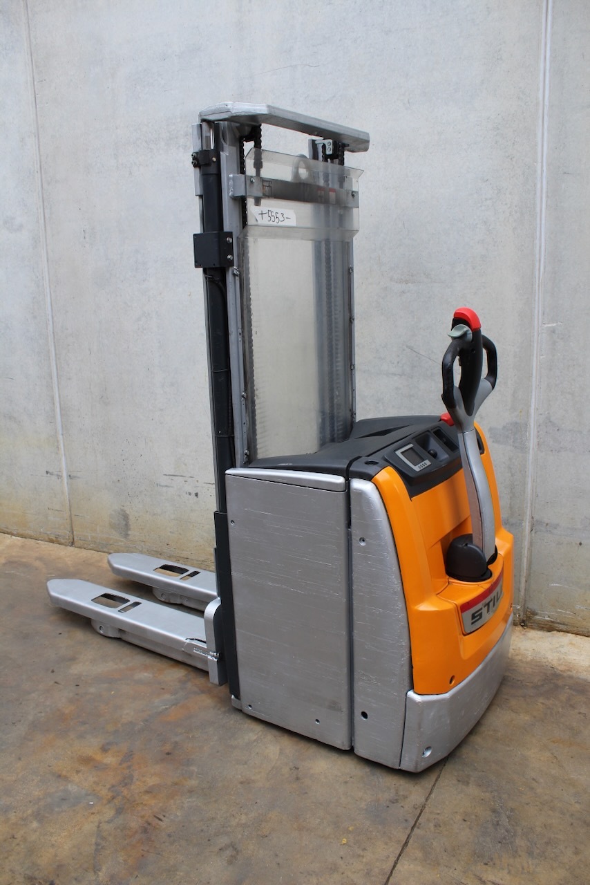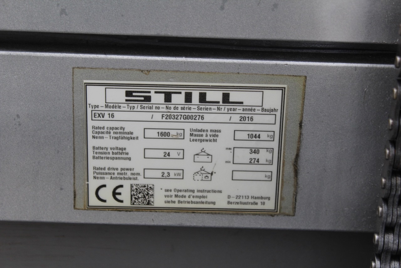 Still EXV 16 Load capacity: 1.600 Kg Lifting height: 2.930 mm Mast: Duplex Fork: 1.150 x 560 mm Build height: 1.920 mm Motorization: Electric Battery: 24v/375Ah Charger: 24 v Good condition, Electric steering wheel. Reference number: 5553