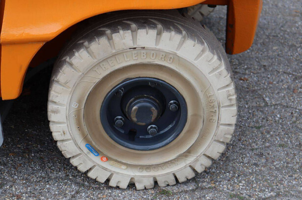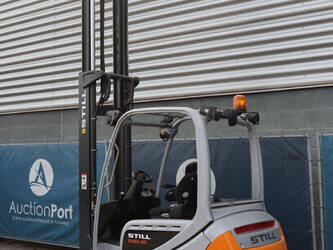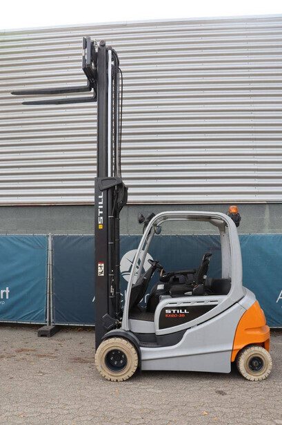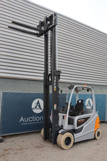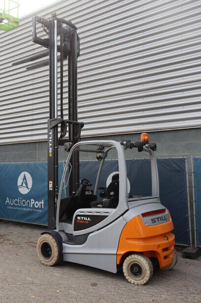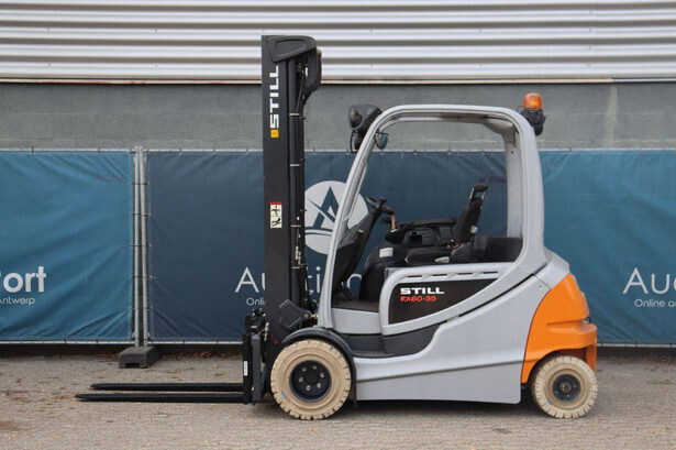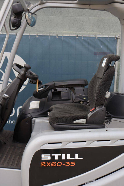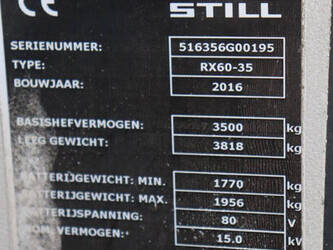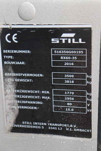 Brand: Still Type: RX60-35 Serial number: 516356G00195 Year of construction: 2016 Fuel: Electric Mast type: Duplex Sideshift: Yes Lifting capacity: 3500 kg Lifting height: 3700 mm Operating hours read: 13869 h Machine weight: 5774 kg Tires: Solid tires Color: orange