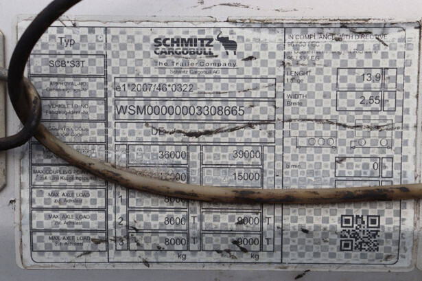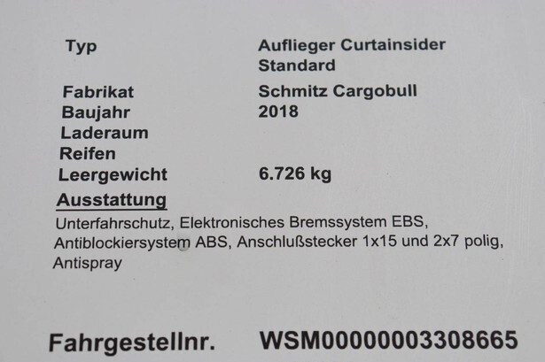 Brand: Schmitz Cargobull Type: Auflieger Curtainsider Standard Chassis number: WSM00000003308665 Year of construction: 2018 MTM: 36000 kg Number of axles: 3 Brakes: Disc brakes, Schmitz ROTOS
