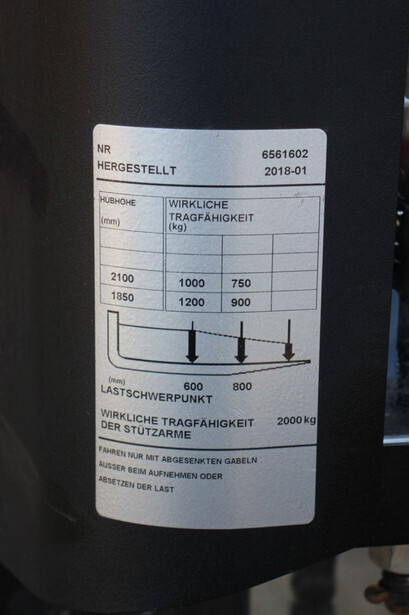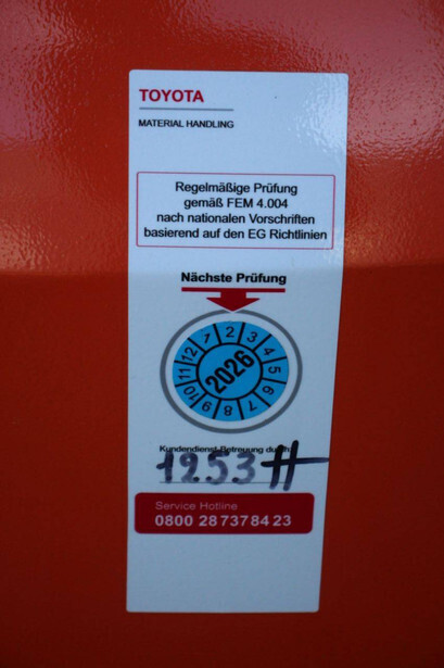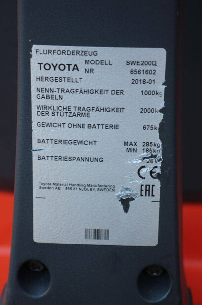 Brand: Toyota Type: SWE200D Serial number: 6561602 Year of construction: 2018 Fuel: Electric Mast type: Duplex Lifting capacity: 2000 kg Lifting height: 2100 mm Operating hours read: 1253 h Machine weight: 960 kg Color: red