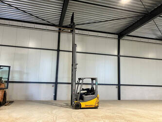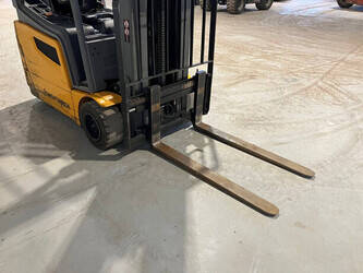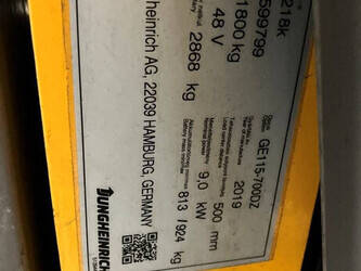 Brand: Jungheinrich Type: EFG 218k Serial number: FN599799 Year of construction: 2019 Fuel: Electric Mast type: Triplex Sideshift: No Lifting capacity: 1800 kg Lifting height: 7000 mm Operating hours read: 6547 h Machine weight: 2868 kg Tires: Pneumatic tires Color: yellow