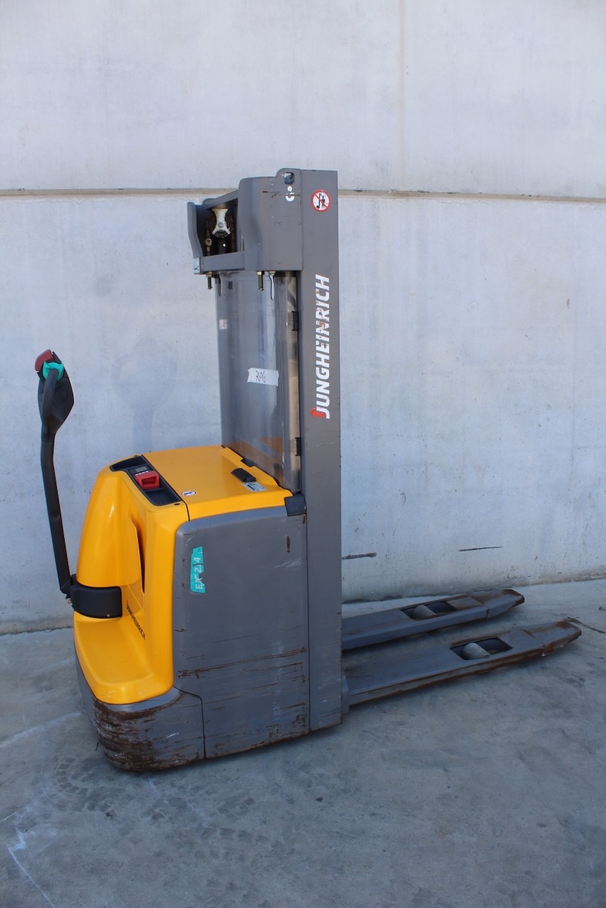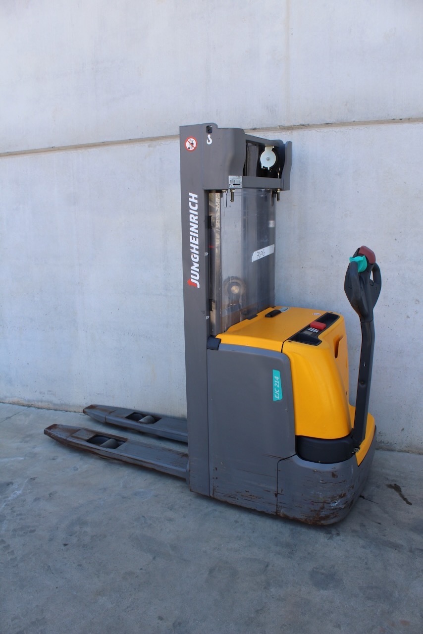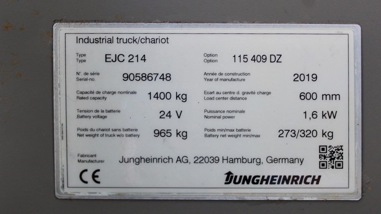 Jungheinrich EJC 214 409 DZ Load capacity: 1.400 Kg Lifting height: 4.090 mm Mast: Triplex Fork: 1.150 x 570 mm Build height: 1.820 mm Motorization: Electric Battery: 24v/246Ah Charger: 24 v Good condition, Electric steering wheel.