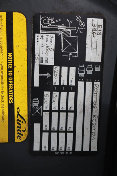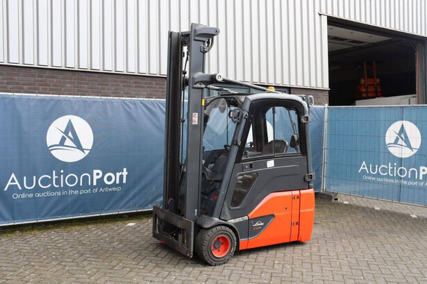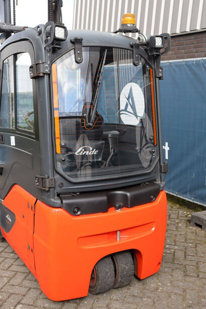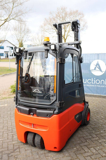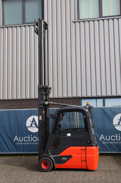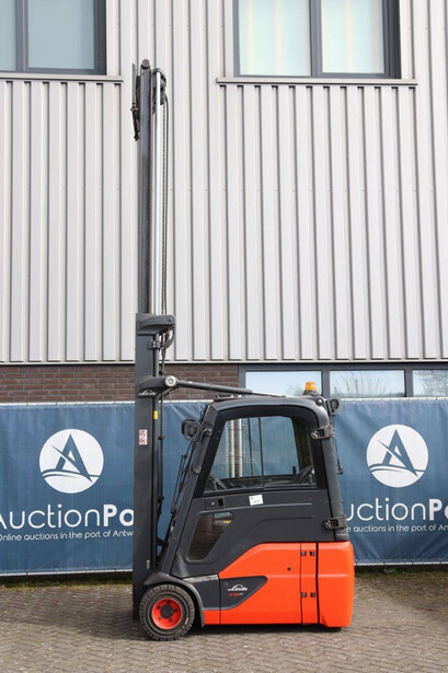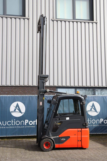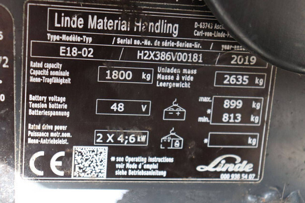 Brand: Linde Type: E18-02 Serial number: H2X386V00181 Year of construction: 2019 Fuel: Electric Mast type: Duplex Sideshift: No Lifting capacity: 1800 kg Lifting height: 4250 mm Recorded operating hours: 1804 h Tires: Solid tires Color: orange