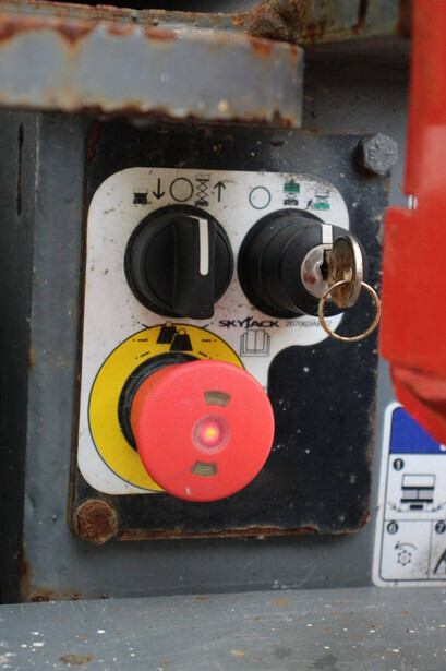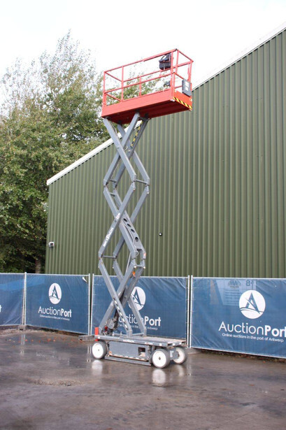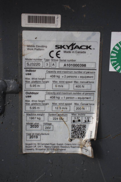 Brand: Skyjack Type: SJ3220 Serial number: A101000398 Year of construction: 2019 Fuel: Electric Lifting capacity: 408 kg Working height: 7.95 m Operating hours read: 256 h Machine weight: 1967 kg Chassis: Wheels Type: Scissor lift Tires: Non-marking tires Color: red