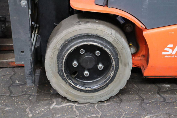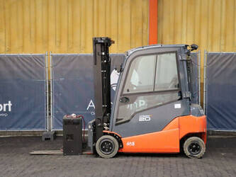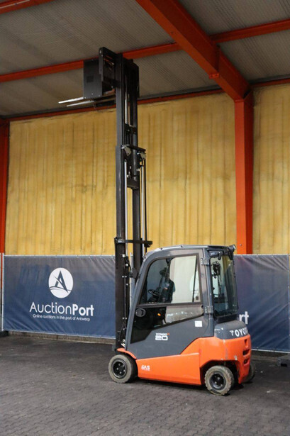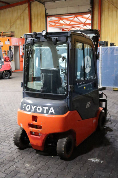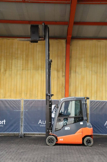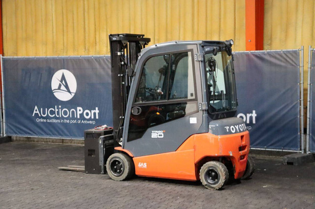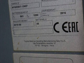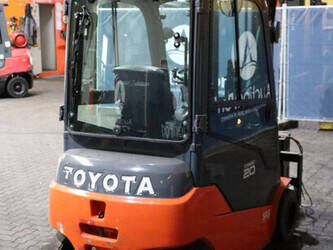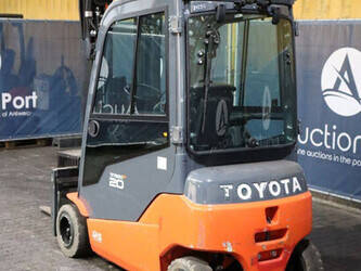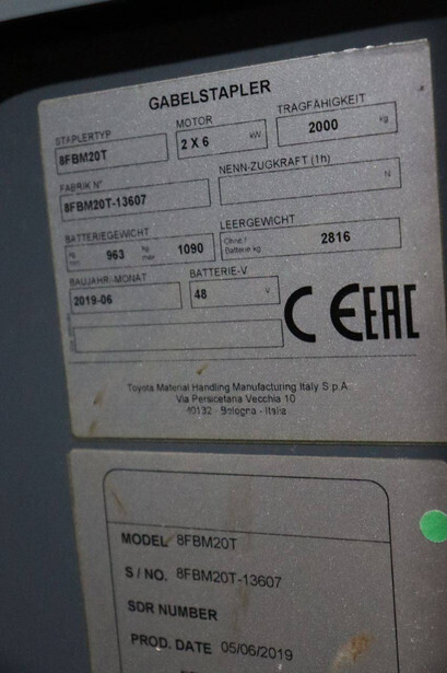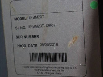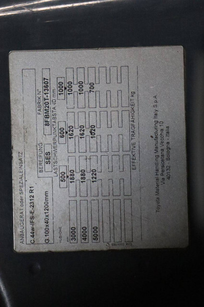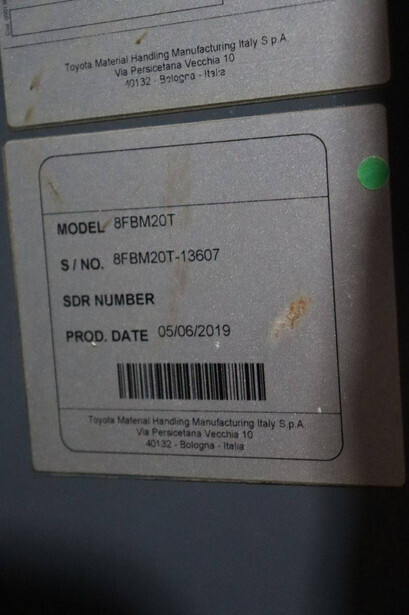Brand: Toyota Type: 8FBM20T Serial number: 8FBM20T-13607 Year of construction: 2019 Fuel: Electric Mast type: Triplex Sideshift: Yes Lifting capacity: 2000 kg Lifting height: 5000 mm Reading operating hours: 1865 h Machine weight: 3879 kg Tires: Non-marking tires Color: orange
