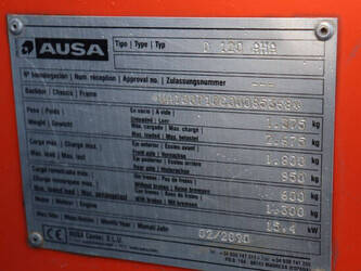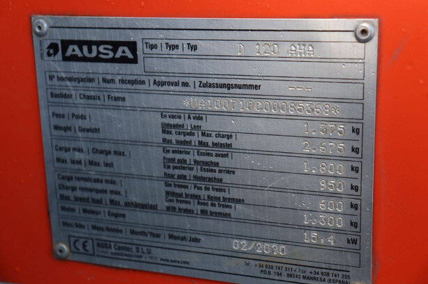 Brand: Ausa Type: D120 AHA Serial number: UA100710C00065366 Year of construction: 2020 Fuel: Diesel Engine power: 15.0 kW Operating hours: 226 h Load capacity: 1800 kg Machine weight: 1375 kg Chassis: Wheels Color: orange