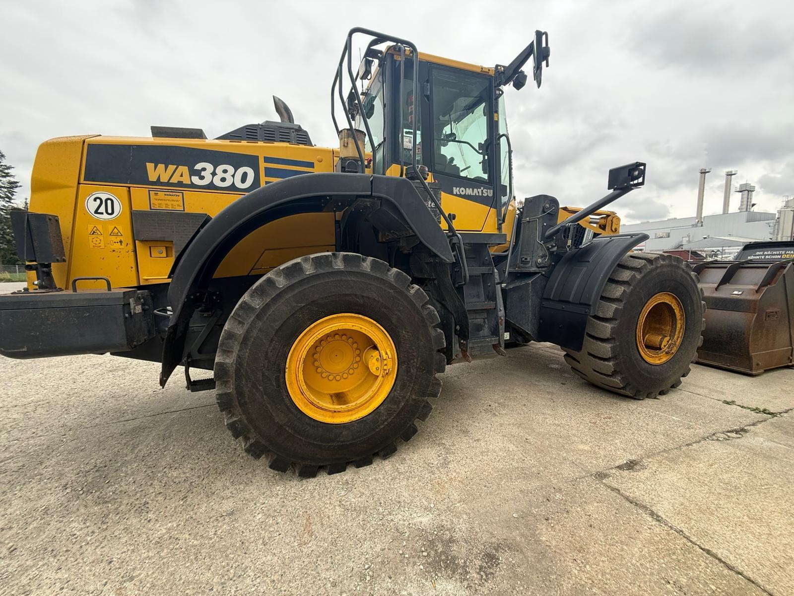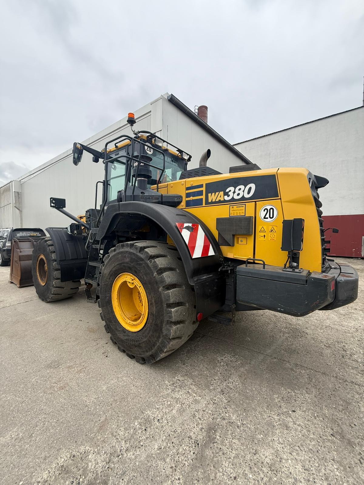 Komatsu WA380-8EO Weight around ca 18,360 kg Engine / Type Komatsu SAA6D Power / HP / KW 194 / 143 Emission standard V Tires / type / size 23.5 R25 *front in % good ca 50% good *back in % good ca 50% good Speed 20 km/h shove (capacity approx. / type) Shovel with cutting edge Aircondition Aircondition Central lubrication Central lubrication CE-certificate Original CE Location Plattling, Germany Transport-dimensions L/W/H 8,380 x 2,925 x 3,390mm other details Turbo II