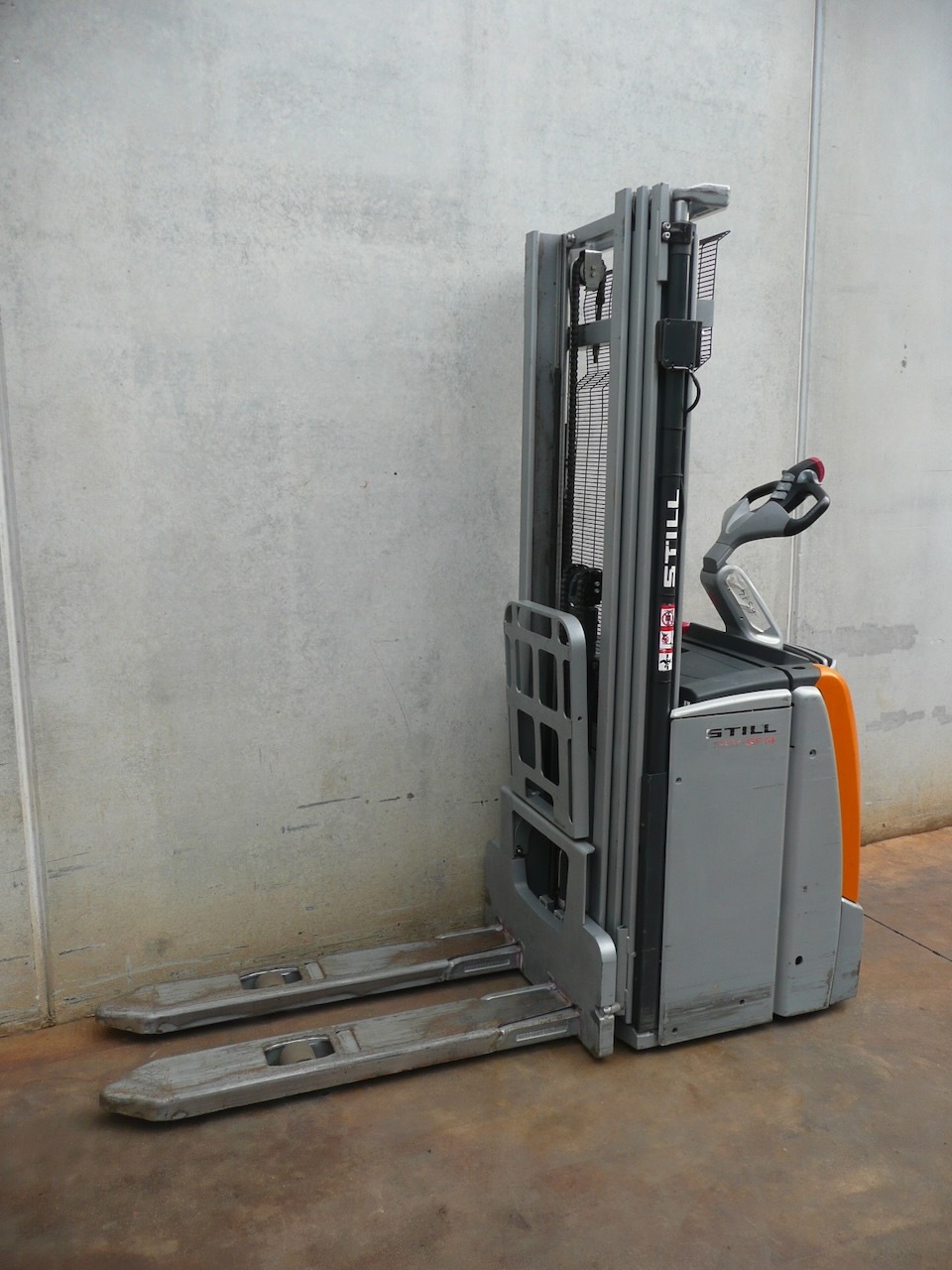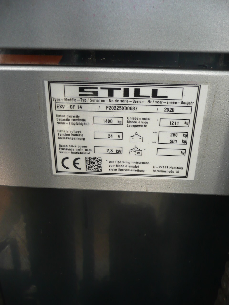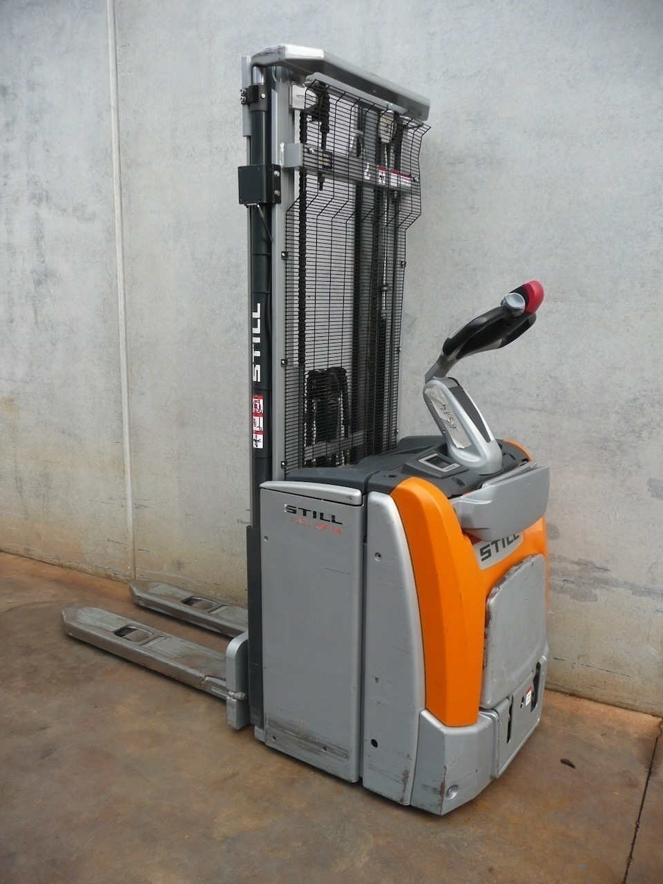 Still EXV-SF14 Load capacity: 1.400 Kg Lifting height: 4.716 mm Mast: Triplex Fork: 1.150 x 560 mm Build height: 2.065 mm Motorization: Electric Battery: 24v/250Ah Charger: 24 v Good condition, Battery condition 72%, Electric steering wheel. Reference number: 6514