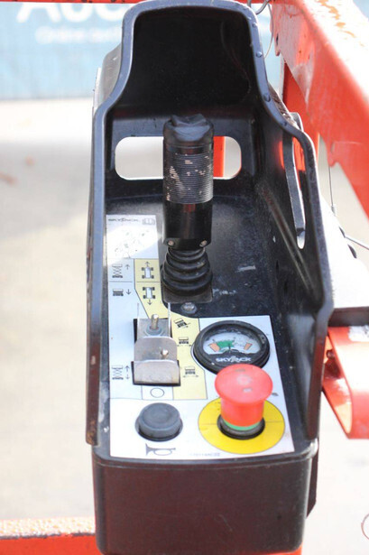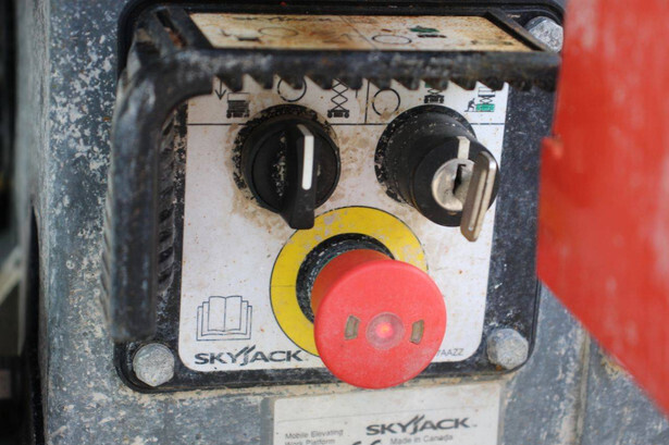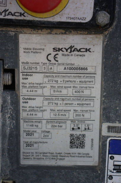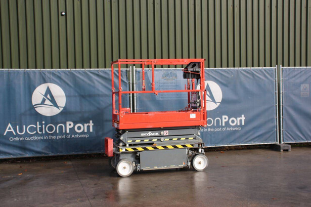 Brand: Skyjack Type: SJ3215 Serial number: A100005866 Year of construction: 2021 Fuel: Electric Lifting capacity: 272 kg Working height: 6.44 m Operating hours read: 106 h Machine weight: 1148 kg Chassis: Wheels Type: Scissor lift Tires: Non-marking tires Color: red