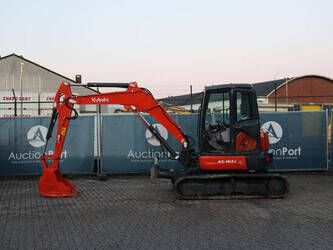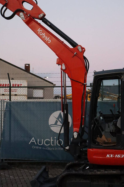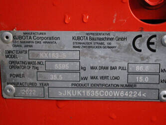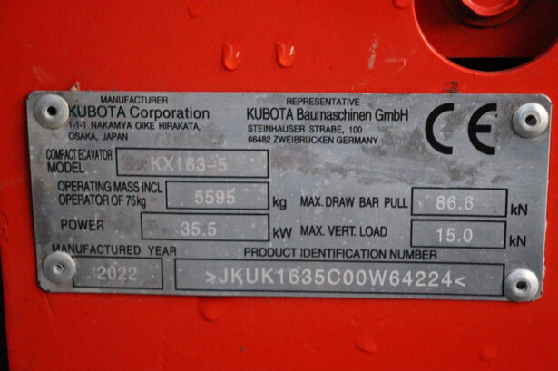 Brand: Kubota Type: KX163-5 Serial number: JKUK1635C00W64224 Year of construction: 2022 Fuel: Diesel Engine power: 35.5 kW Quick change: No Operating hours read: 463 h Machine weight: 5595 kg Running gear: Tracks Color: red