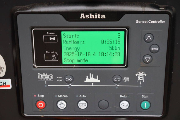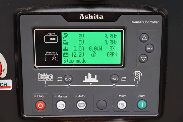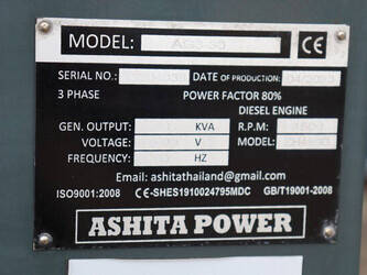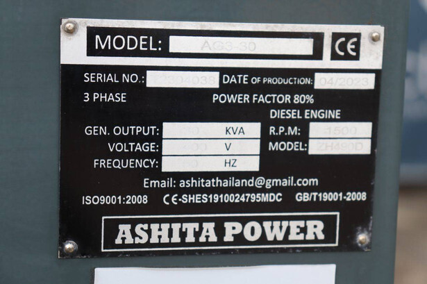 Brand: Ashita Type: AG3-30 Serial number: T2304038 Year of construction: 2023 Fuel: Diesel Power: 30 kVA Voltage: 400 V Reading operating hours: 35 h Color: red