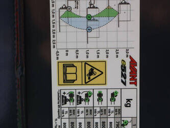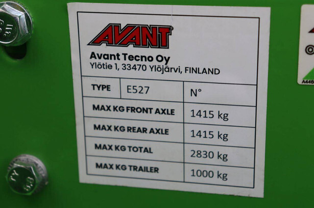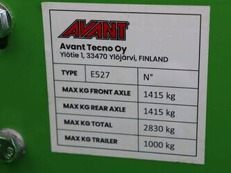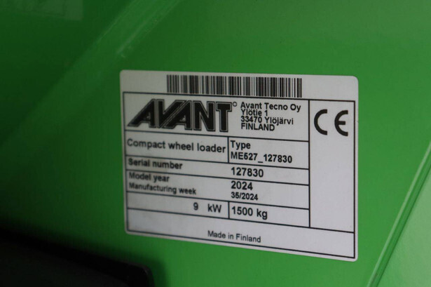 Brand: Avant Type: E 527 TDL Serial number: 127830 Year of construction: 2024 Fuel: Electric Engine power: 9.0 kW Reading operating hours: 2 h Machine weight: 1500 kg Lifting capacity: 900 kg Lifting height: 2800 mm Tires: Pneumatic tires Color: green