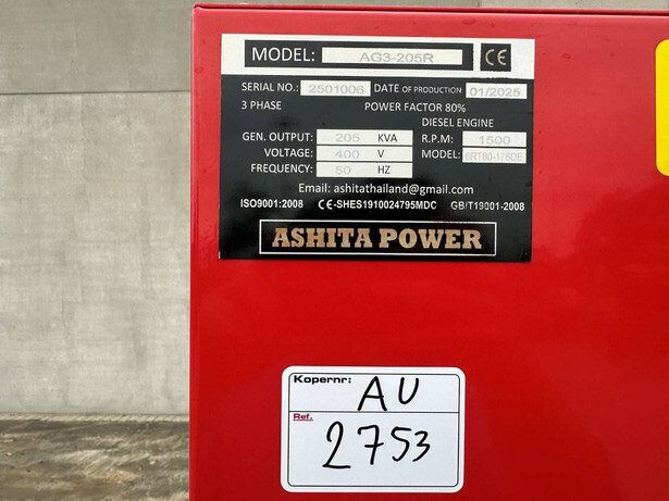 Brand: Ashita Type: AG3-205R Serial number: 2501006 Year of construction: 2025 Fuel: Diesel Cylinders: 4 Engine Brand: 6RT80-176DE Power: 205 kVA Color: red Transport dimensions: 3000x1150x1800 mm