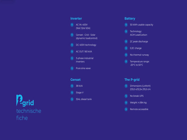 Online veiling van P-Grid hybride energieoplossing die een Stage 5-dieselgenerator met batterijen combineert, voor 'peak shaving' bij bouw- en torenkranen en andere toepassingen in de industrie. Er zijn standaard units voor de Europese (50Hz) en buitenlandse markt (60Hz). Verder ook benzine en diesel watergekoelde noodstroomgeneratoren met Honda en Kubota motoren.