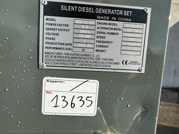 Brand: Kawakenki Type: KK50-III-SSS Serial number: 25080480 Year of construction: 2025 Fuel: Diesel Engine type: N4105ZD Power: 50 kVA Cylinders: 4 Reading operating hours: 0 h Machine weight: 760 kg Color: red Transport dimensions: 2030x800x1130 mm
