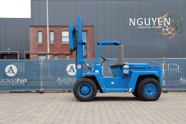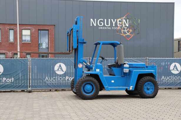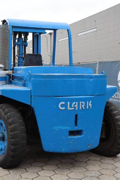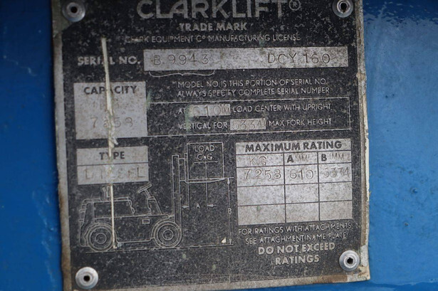 Brand: Clark Type: DCY 160 Serial number: B9943 Fuel: Diesel Mast type: Duplex Sideshift: No Lifting capacity: 7258 kg Lifting height: 5334 mm Tires: Pneumatic tires Color: blue