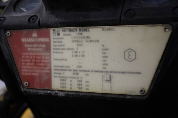Brand: Hyster Type: H2.00XL Serial number: C177B02836L Year of construction: 1990 Fuel: Diesel Mast type: Triplex Sideshift: No Lifting capacity: 2000 kg Lifting height: 3880 mm Operating hours read: Not known Machine weight: 3515 kg Tires: Solid tires Color: yellow Machine description: Machine starts, drives, lifts and lowers.
