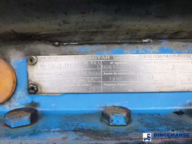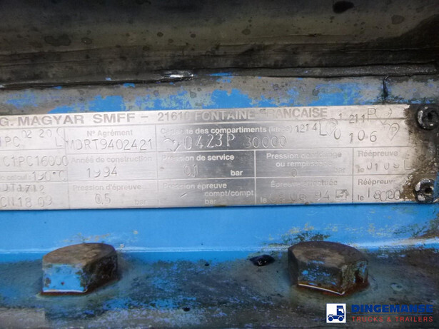 Bitumen tank, Insulated stainless steel, Capacity 30000 liters, 1 Compartment, Tank material code Z7CN 18.09, Test pressure 0.50 bar, Max working pressure 0.10 bar, Air suspension, Alloy wheels, ABS, SMB axles, Drum brakes, Shipment dimensions 1080x250x350 cm