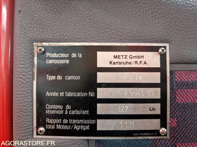 Mercedes-Benz 1524 Fuel: gas Axle 1 common tyre size: 275/70R22.5 Gearbox type: manual FR: Type de véhicule Camion de pompier Etat carrosserie: Moyen Etat intérieur: Moyen Etat des pneus: Voir photos Climatisation: Non Echelle pivotante a mouvement combinés 30 mètres Mets type DLK30 de 1998 Véhicule roulant Joint de culasse à remplacer Quelques accros carrosserie Sellerie usée et trouée Volant usé Batterie à remplacer Révision complète à prévoir En l'état Ref No:KE49315 VIN: WDB6790271K298665