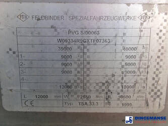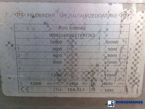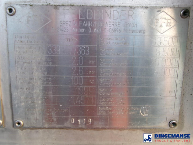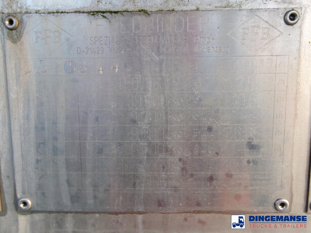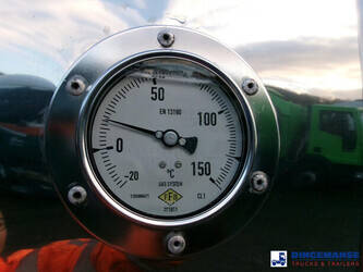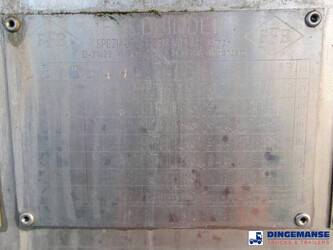 Chemical tank, Insulated stainless steel (inox), Capacity 33500 liters, 1 Compartment, Steam heating, Hydraulic pump, Material code 1.4571, Test pressure 2.6 bar, Max working pressure 2.0 bar, Air suspension, Disc brakes, Saf axles, ABS, Alloy wheels, Tyres 385/65R22.5, Shipment dimensions:1190x250x355 cm