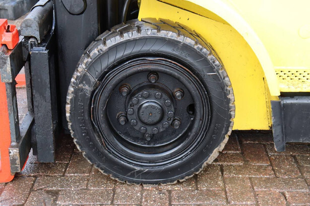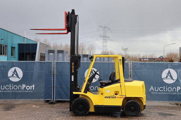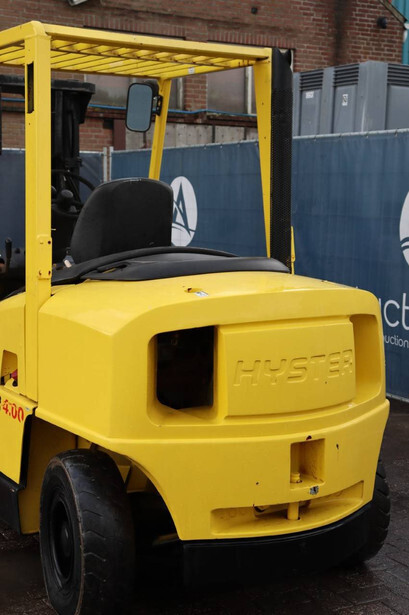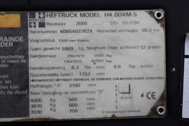Brand: Hyster Type: H4.00XM-5 Serial number: K005A02762X Year of construction: 2000 Fuel: Diesel Mast type: Duplex Sideshift: No Lifting capacity: 4000 kg Lifting height: 3100 mm Operating hours read: Not known Machine weight: 5969 kg Tires: Solid tires Color: yellow