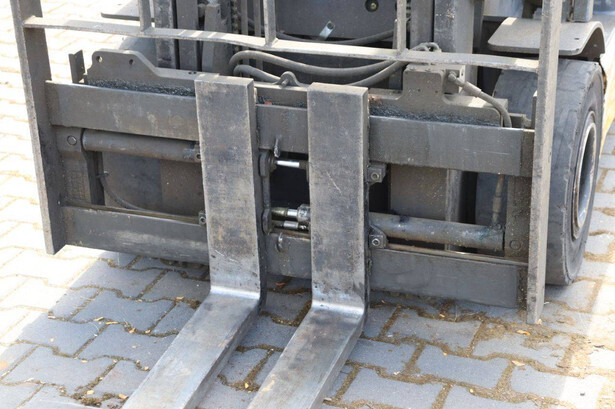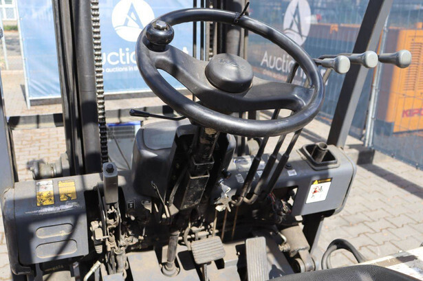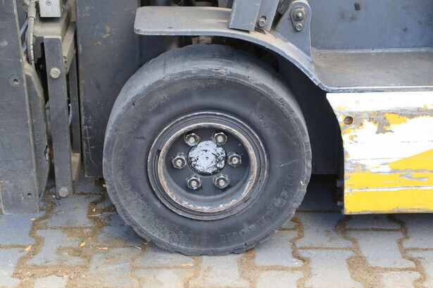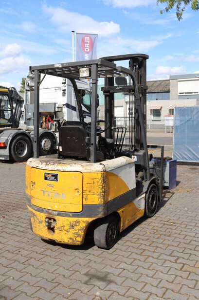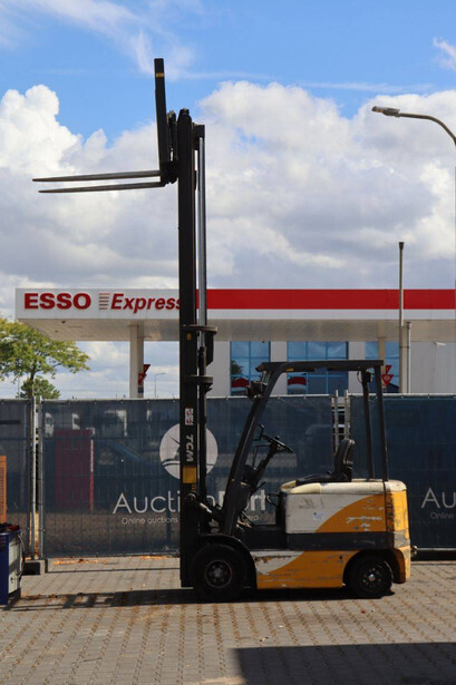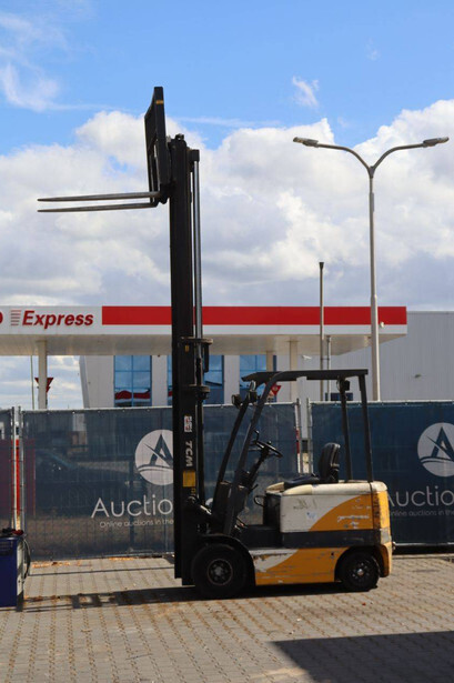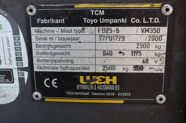 Brand: TCM Type: FB25-6 Serial number: 77P01729 Year of construction: 2000 Fuel: Electric Mast type: Duplex Sideshift: Yes Lifting capacity: 2500 kg Lifting height: 4100 mm Operating hours read: 27360 h Machine weight: 2500 kg Tires: Solid tires Color: yellow