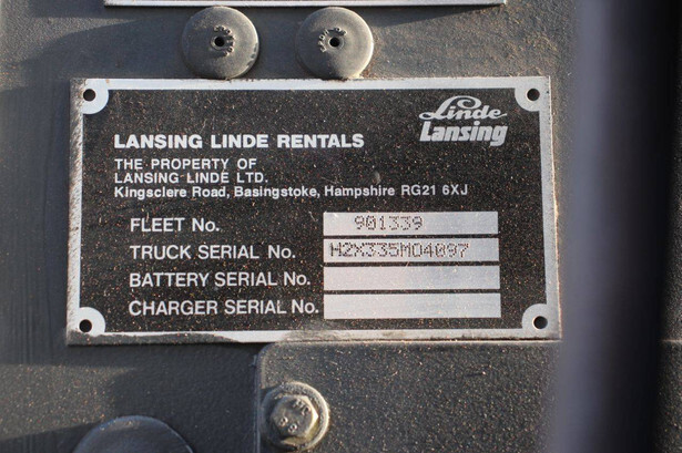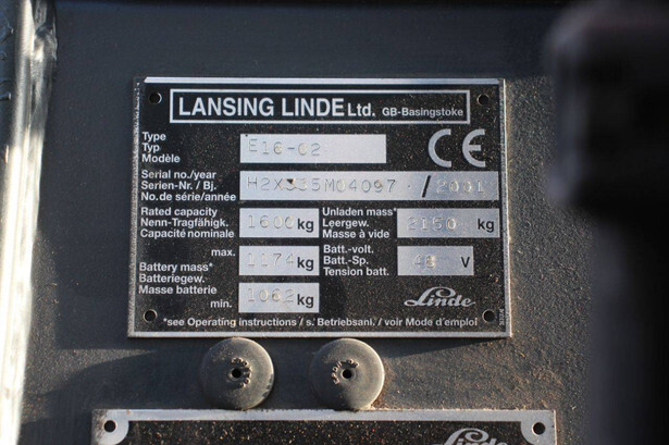 Brand: Linde Type: E16-02 Serial number: H2X335M04097 Year of construction: 2001 Fuel: Electric Mast type: Triplex Sideshift: Yes Lifting capacity: 1600 kg Operating hours read: 5288 h Machine weight: 3324 kg Tires: Solid tires Color: red