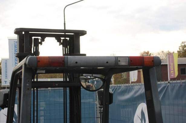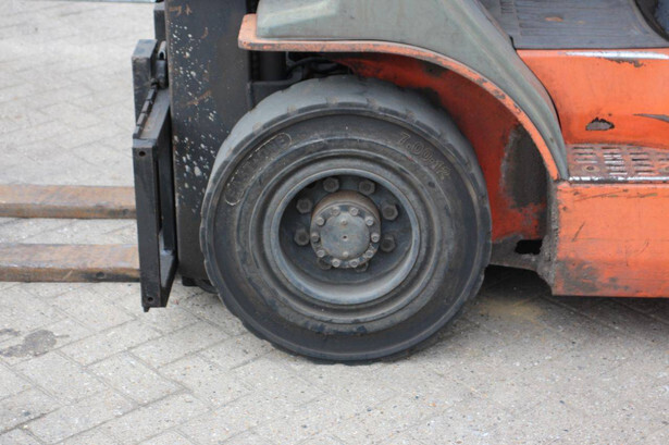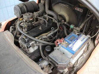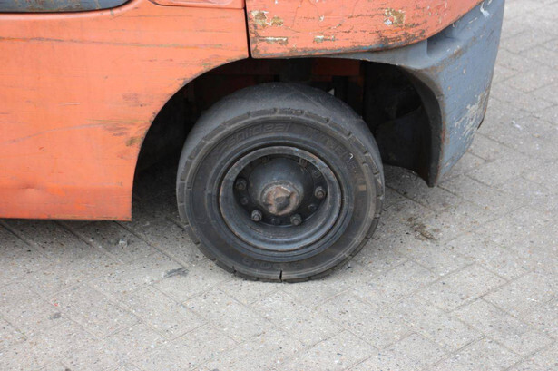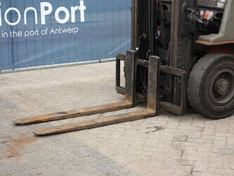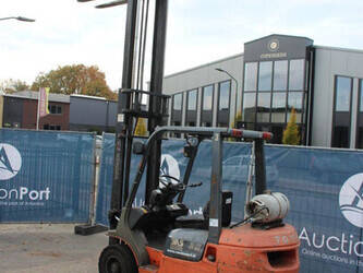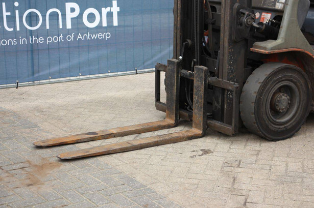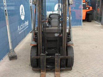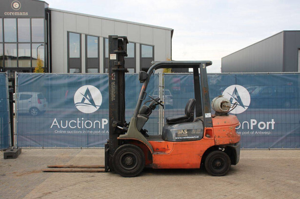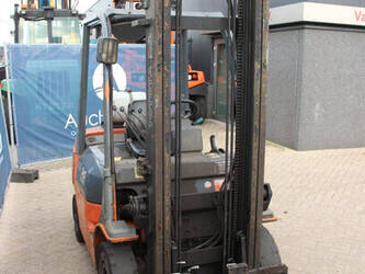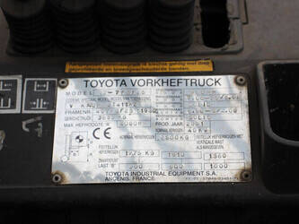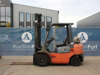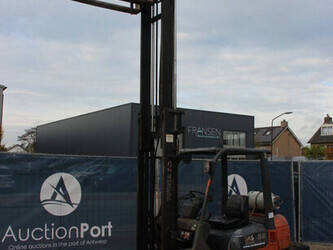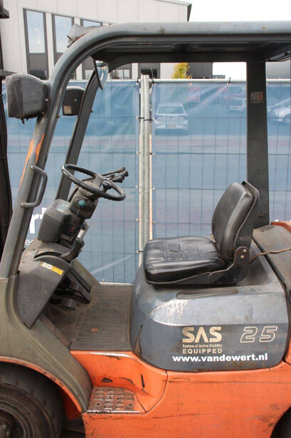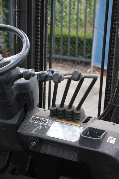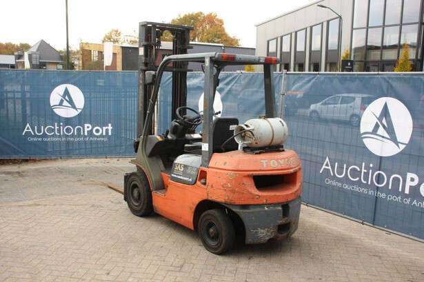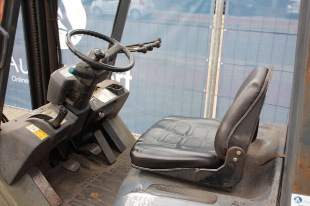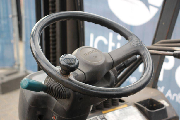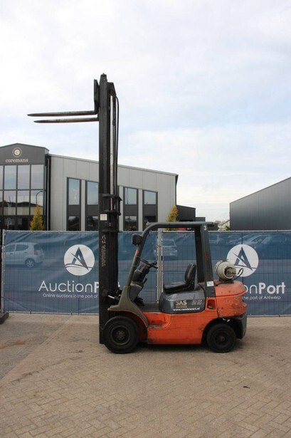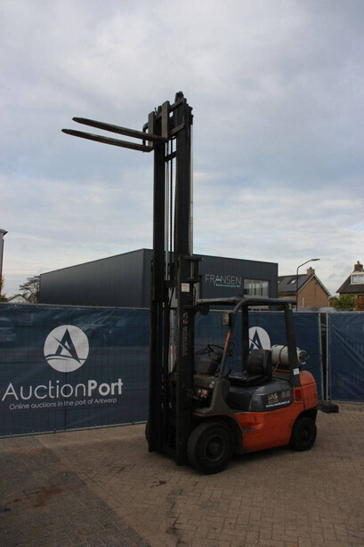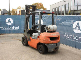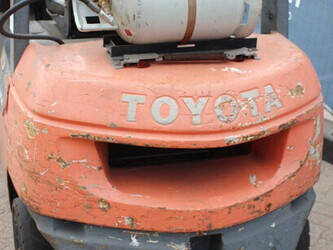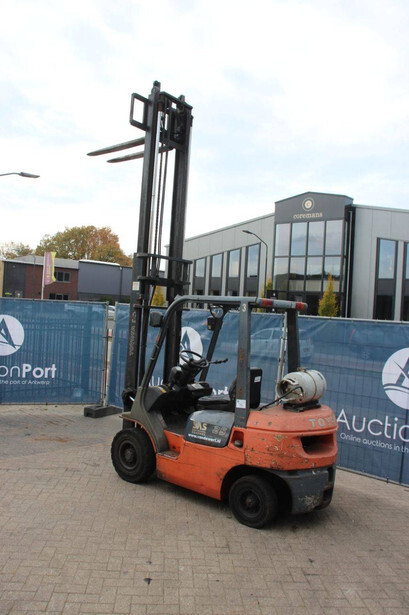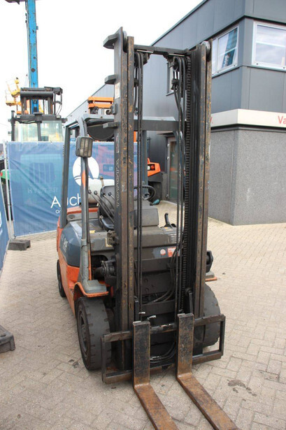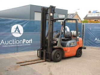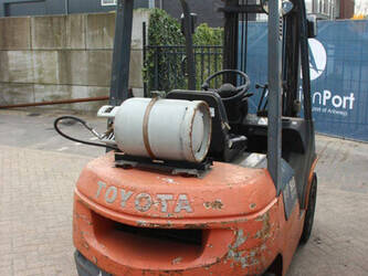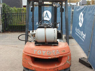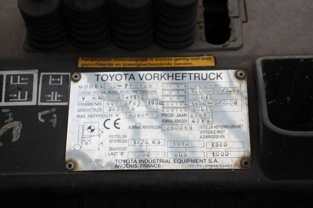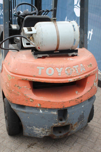Brand: Toyota Type: 42-7FGF25 Serial number: 3T4111AZ Year of construction: 2001 Fuel: LPG Mast type: Duplex Sideshift: No Lifting capacity: 2500 kg Lifting height: 4000 mm Operating hours read: Not known Machine weight: 3680 kg Tires: Solid tires Color: orange