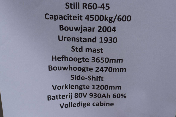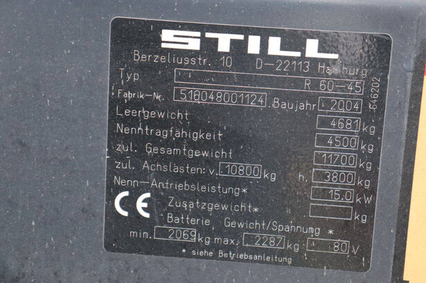 Brand: Still Type: R60-45 Serial number: 516048001124 Year of construction: 2004 Fuel: Electric Mast type: Not known Sideshift: Yes Lifting capacity: 4500 kg Lifting height: 3650 mm Recorded operating hours: 1930 h Tires: Solid tires Color: orange