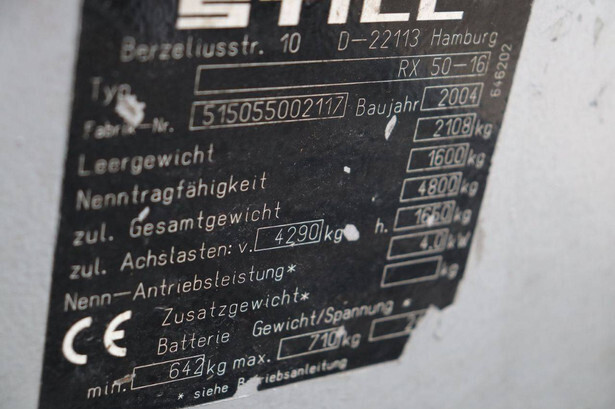 Brand: Still Type: RX50-16 Serial number: 515055002117 Year of construction: 2004 Fuel: Electric Mast type: Duplex Sideshift: No Lifting capacity: 1600 kg Machine weight: 2878 kg Tires: Solid tires Color: orange