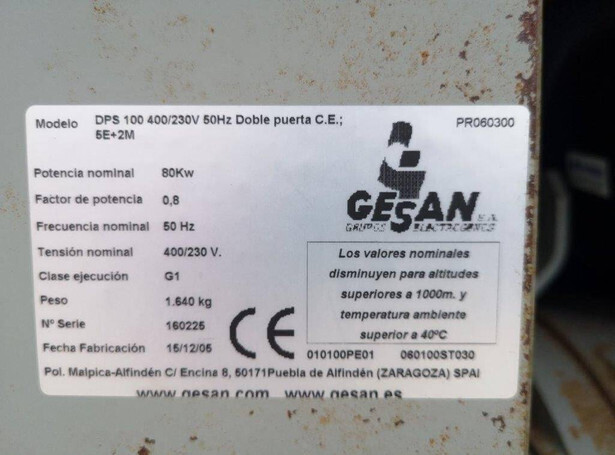 Brand: Gesan Type: DPS100 Serial number: 160225 Year of construction: 2005 Fuel: Diesel Engine make and type: Perkins 1104C-44TA Power: 110 kVA Generator: Stamford Operating hours read: 21167 h Machine weight: 1640 kg Color: red Transport dimensions: 2300x1100x1500 mm