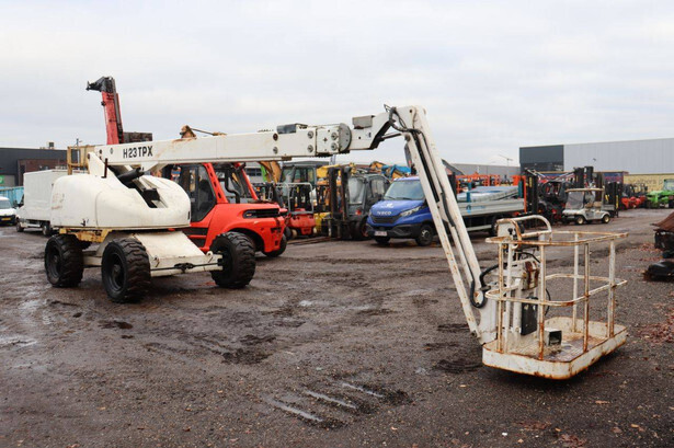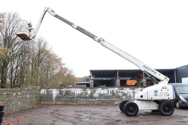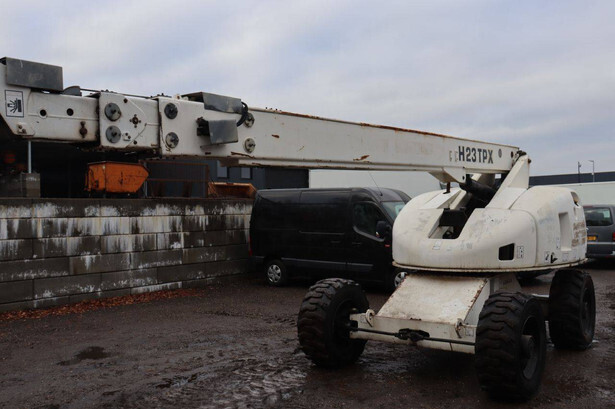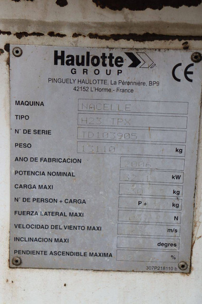 Brand: Haulotte Type: H23TPX Serial number: TD103905 Year of construction: 2006 Fuel: Diesel Lifting capacity: 230 kg Working height: 22.6 m Operating hours read: 5280 h Machine weight: 13110 kg Chassis: Wheels Type: Telescopic boom lift Tires: Pneumatic tires Color: white