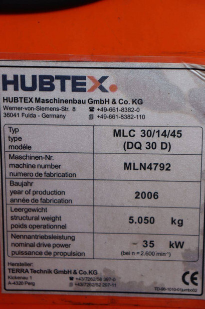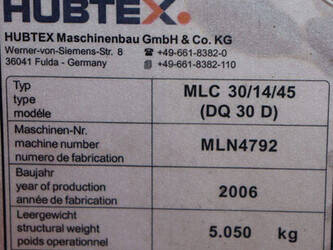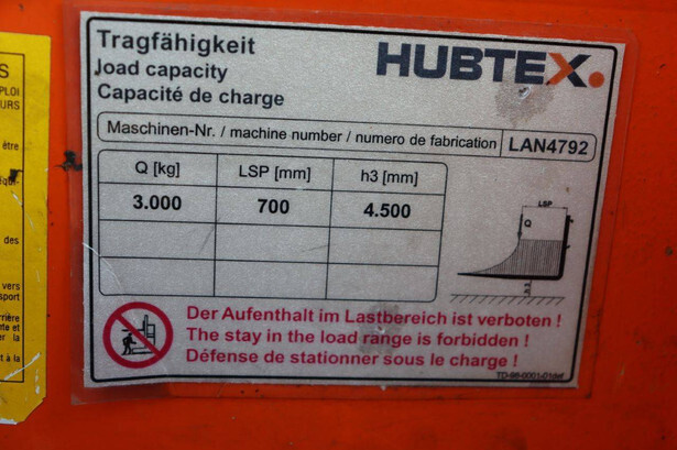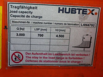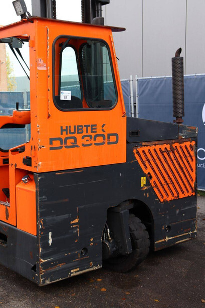 Brand: Hubtex Type: DQ30D Serial number: MLN4792 Year of construction: 2006 Fuel: Diesel Mast type: Duplex Sideshift: No Lifting capacity: 3000 kg Lifting height: 4500 mm Operating hours read: 2277 h Machine weight: 5050 kg Tires: Solid tires Color: orange