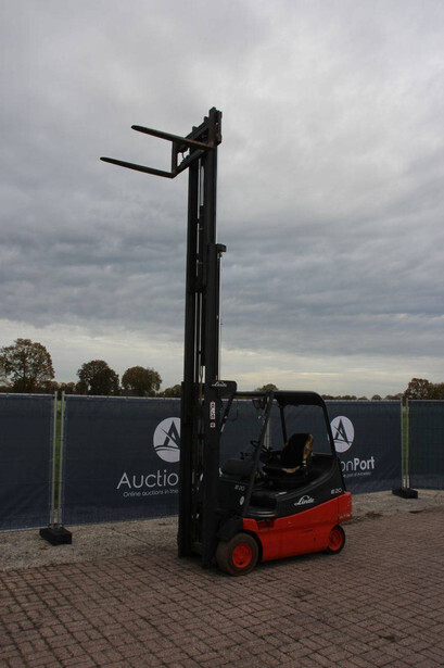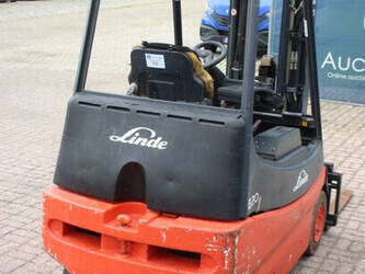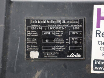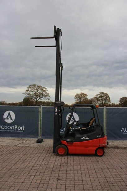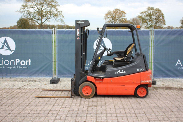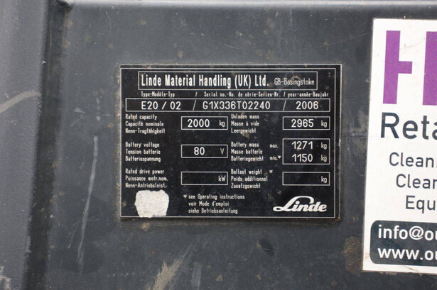 Brand: Linde Type: E20/02 Serial number: G1X336T02240 Year of construction: 2006 Fuel: Electric Mast type: Triplex Sideshift: Yes Lifting capacity: 2000 kg Operating hours read: 5198 h Machine weight: 4236 kg Tires: Solid tires Color: red