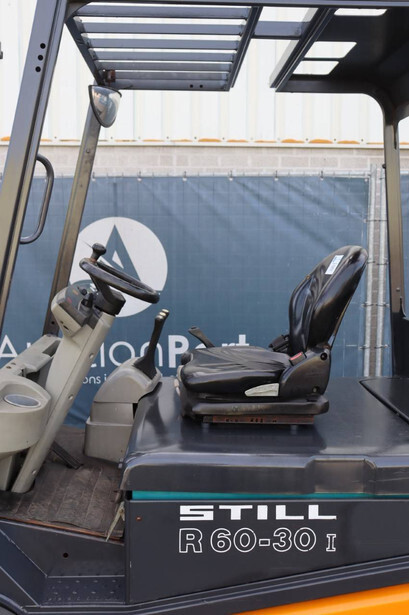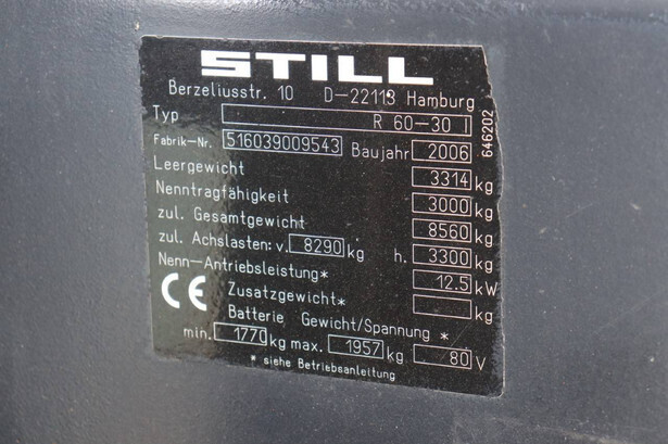 Brand: Still Type: R 60-30 Serial number: 516039009543 Year of construction: 2006 Fuel: Electric Mast type: Triplex Sideshift: Yes Lifting capacity: 3000 kg Operating hours read: 3520 h Machine weight: 5271 kg Tires: Solid tires Color: orange