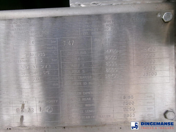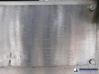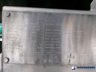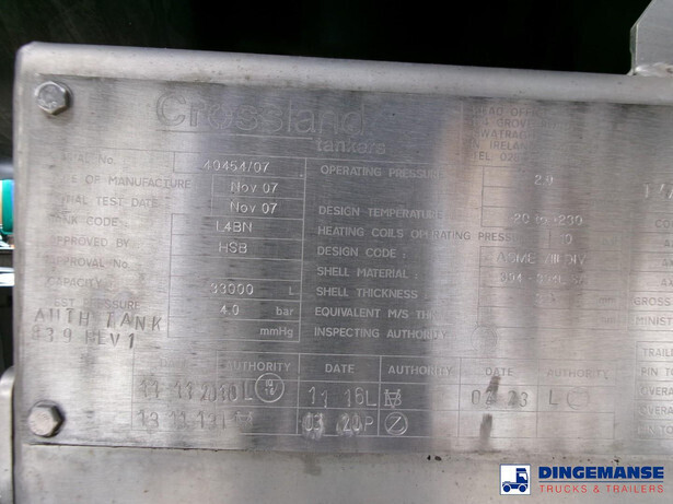 Bitumen tank, Insulated stainless steel (inox), Capacity 33000 litres, 1 Compartment, Hydraulic Compressor, Steam heating, Max working pressure 2.0 bar, Test pressure 4.0 bar, Tank material code 304 L s/s, Air suspension, Mercedes axles, Disc brakes, ABS, Shipment dimensions 1130x250x370 cm