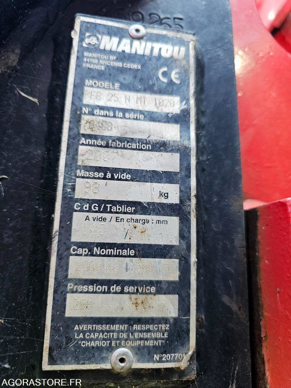 Manitou BT420 Power: 42 Axle number: 2 FR: Type de véhicule TRANSPALETTE poids net à vide: 4610 Matériel hors d'état de fonctionnement Moteur a remplacer Corrosion Revision complète a prevoir Flexible a contrôler Hydraulique a tester Siege a remplacer 31kW Ref No:QX48837 VIN: 1238097