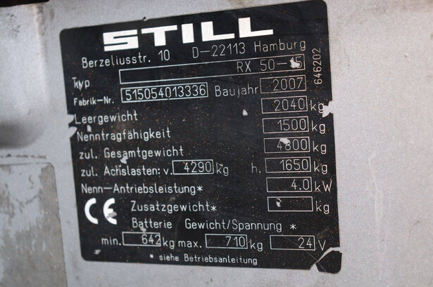 Brand: Still Type: RX 50-15 Serial number: 515054013336 Year of construction: 2007 Fuel: Electric Mast type: Duplex Sideshift: Yes Lifting capacity: 1500 kg Lifting height: 5430 mm Machine weight: 2750 kg Tires: Solid tires Color: yellow