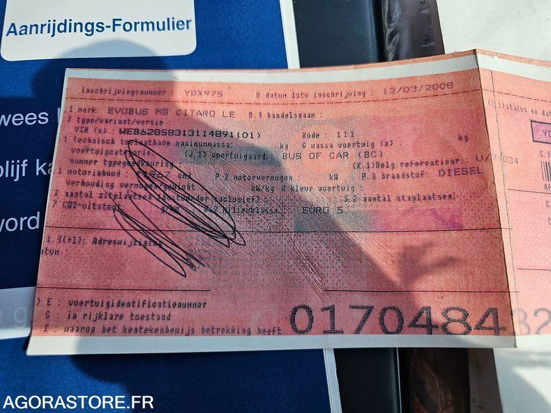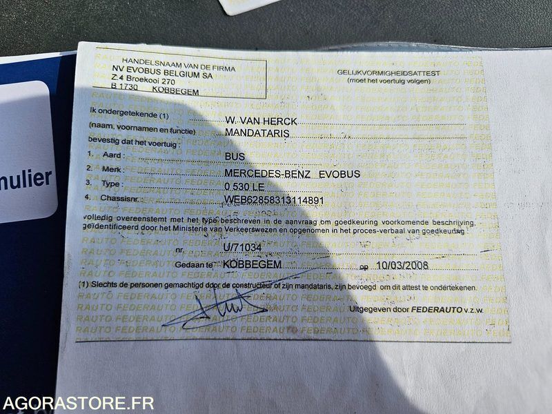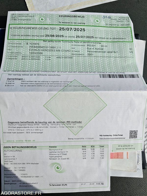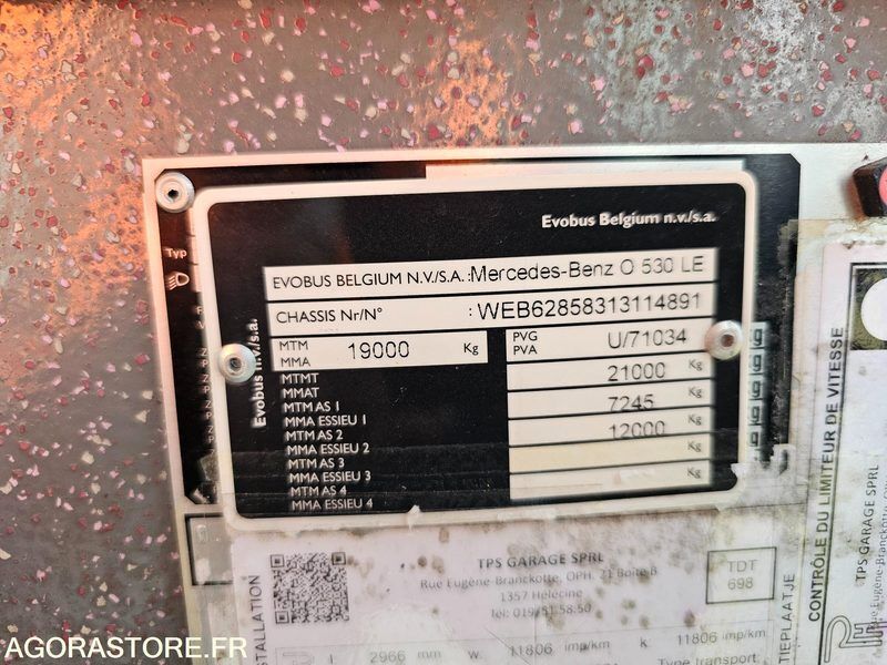 Mercedes-Benz Citaro Engine volume: 11970 Fuel: diesel Euro: 5 Axle number: 2 Axle 1 common tyre size: 275/70R22.5 Conditioner: 1 Gearbox type: automatic EN: SellerKEOLIS Rolling stock?Yes Vehicle TypeBus BrandMercedes ModelCitaro Serial Number / VINWEB62858313114891 Mileage941740 Displacement11967 EnergyDiesel Euro StandardEURO 5 Manual / automatic gearboxAutomatic Number of axles and/or Type of axles2 Axle gearbox engine conditionIn working order Tyre size275/70R22.5 Tire conditionMedium Bodywork conditionMedium Domestic stateMedium BeltNo Air conditioningYes WebastoYes PRMYes BreathalyzerNo ToiletsNo DescriptionVehicle Battery to be replaced Right rear impact Corrosion Some other bodywork snags Windshield impacts Date of registration12/03/2008 IMPORTANTVehicle located in Belgium, when collecting, provide a suitable means of loading or provide W garage plates. Payment termsPayment within 7 days by bank transfer after receipt of the winning bid confirmation email. Withdrawal proceduresWithdrawal by appointment at the expense of the Buyer after receipt of payment and authorization of withdrawal. The Buyer has a period of 15 calendar days to collect the property, from the receipt of the winning bid confirmation email FR: VendeurKEOLIS Matériel roulant ?Oui Type de véhiculeBus MarqueMercedes ModèleCitaro Numéro de série / VINWEB62858313114891 Kilométrage941740 Cylindrée11967 EnergieDiesel Norme EuroEURO 5 Boite manuelle / automatiqueAutomatique Nombre d'essieux et/ou Type d'essieux2 Etat moteur boite pontEn état de fonctionnement Taille des pneumatiques275/70R22,5 Etat des pneusMoyen Etat carrosserieMoyen Etat intérieurMoyen CeintureNon ClimatisationOui WebastoOui PMROui EthylotestNon ToilettesNon DescriptionVéhicule roulant Batterie à remplacer Choc arrière droit Corrosion Quelques autres accrocs carrosserie Impacts pare-brise Date de mise en circulation12/03/2008 IMPORTANTVéhicule situé en Belgique, lors du retrait, prévoir un moyen de chargement adapté ou de prévoir des plaques W garage. Modalités de paiementPaiement sous 7 jours par virement bancaire après réception du mail de confirmation d'enchère gagnante. Modalités de retraitRetrait sur RDV à la charge de l'Acheteur après réception du paiement et autorisation de retrait. L'Acheteur dispose d'un délai de 15 jours calendaires pour retirer le bien, à compter de la réception du mail de confirmation d'enchère gagnante Ref No:416288 VIN: WEB62858313114891