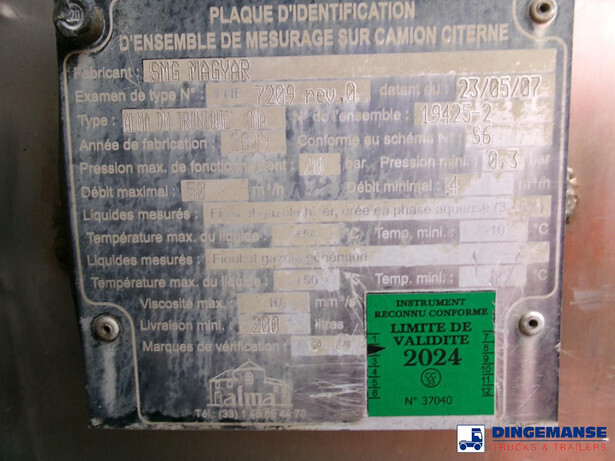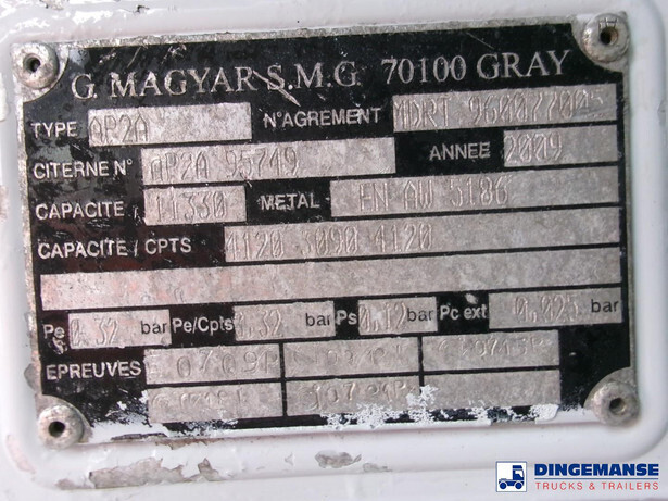 Magyar aluminium fuel tank, Capacity Net: 11588 // Nominal: 11000, 3 Compartments (Net: 4236; 3158; 4194 // Nominal: 4000; 3000; 4000, Mouvex Hydraulic pump, Alma digital counter, Hose reel, Vapour return, Overload sensor, Test pressure 0.32 bar, Max work pressure 0.12 bar // Truck 4x2, Euro 5, Adblue, Manual gearbox with 6 gears, Diff. lock, Full steel suspension, Day cabin, Airconditioning, Digital tachograph, Shipment dimensions 665x250x315 cm