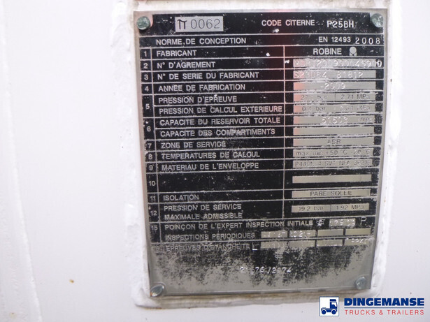 Robine steel gas (LPG) tank, capacity 51503 liter, 1 Compartment, Test pressure 25 bar, Max working pressure 19.3 bar, Year of construction 2009, Tank material code: P25BH // P 440 NJ4 NFA 36215, Air suspension, lift axle, Alloy wheels, ABS, Disc brakes, Mercedes axles, Shipment dimensions 1300x250x350 cm