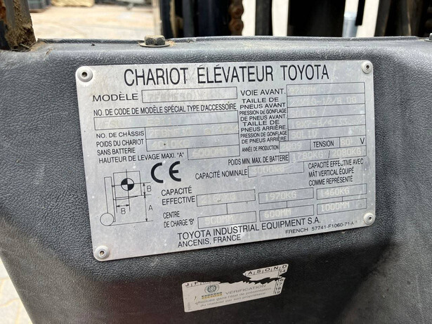 Brand: Toyota Type: 7FBMF30 Serial number: 7FBMF35 14034 Year of construction: 2009 Fuel: Electric Mast type: Duplex Sideshift: Yes Lifting capacity: 3000 kg Lifting height: 6000 mm Machine weight: 5200 kg Tires: Pneumatic tires Color: orange