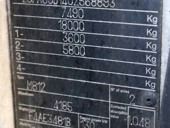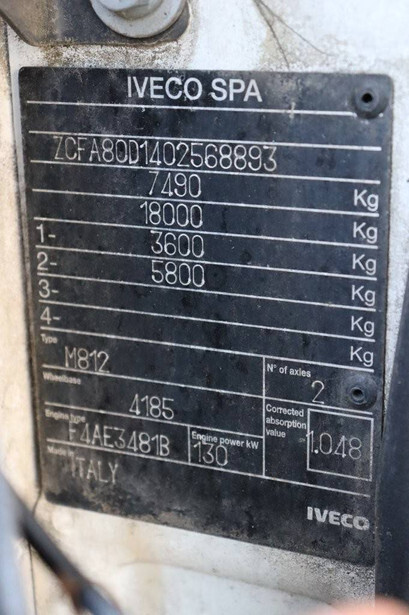 Brand: Iveco Type: ML80E18/P Chassis number: ZCFA80D1402568893 Year of construction: 2010 Fuel: Diesel Engine power: 177.0 HP Euronorm: Not known Odometer reading: 100153 KM Transmission: Manual Number of axles: 2 Color: white