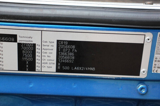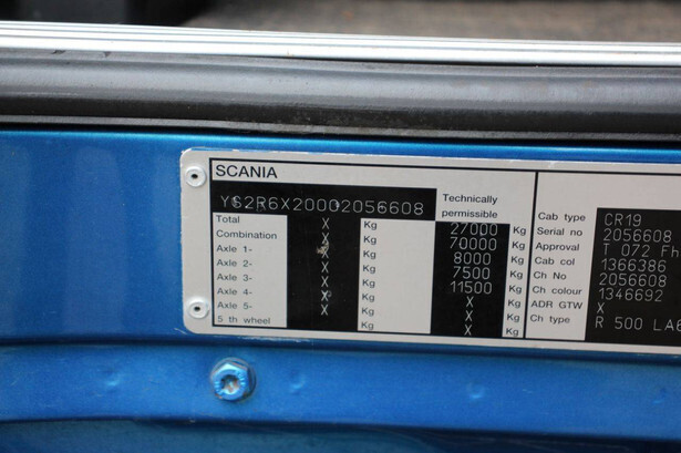 Brand: Scania Type: R500 Chassis number: YS2R6X20002056608 Year of construction: 2010 Fuel: Diesel Engine power: 501 HP Euro standard: Euro 5 Transmission: Automatic Engine operating hours: 13469 h Number of axles: 3 Color: blue